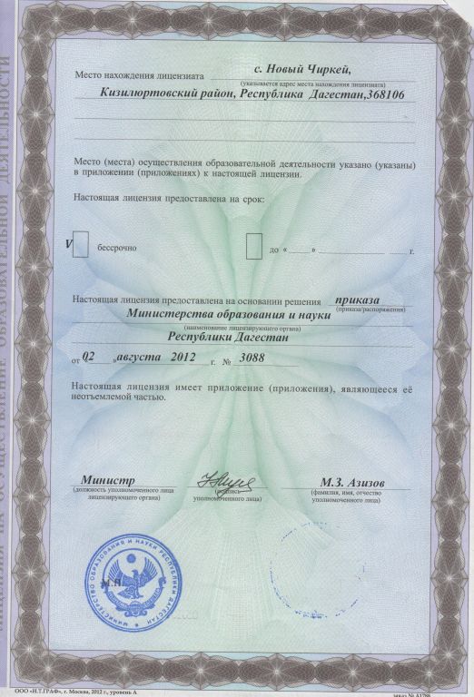 Адрес местонахождения образовательной организации* 368106, Республика Дагестан, Кизилюртовский район, селение Новый Чиркей, ул. Комсомольская № 19